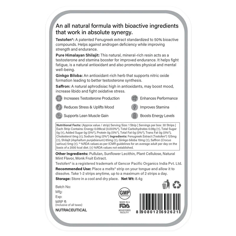 Our formula features a powerful blend of Testofen® , Pure Himalayan Shilajit, Ginkgo Biloba Extract and Saffron, each known for its unique benefits. Testofen® (patented & clinically tested natural fenugreek extract) helps boost testosterone levels & imrpove blood flow. Pure Himalayan Shilajit, with its adaptogenic properties, reduces fatigue, enhances stamina. Ginkgo Biloba improves circulation, mental clarity, and focus, while Saffron promotes mood balance, reduces stress, and supports overall mental wellness.